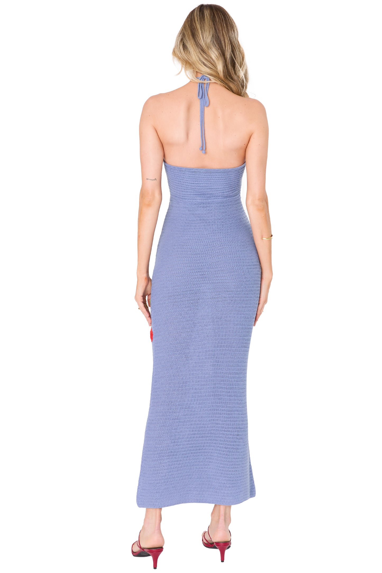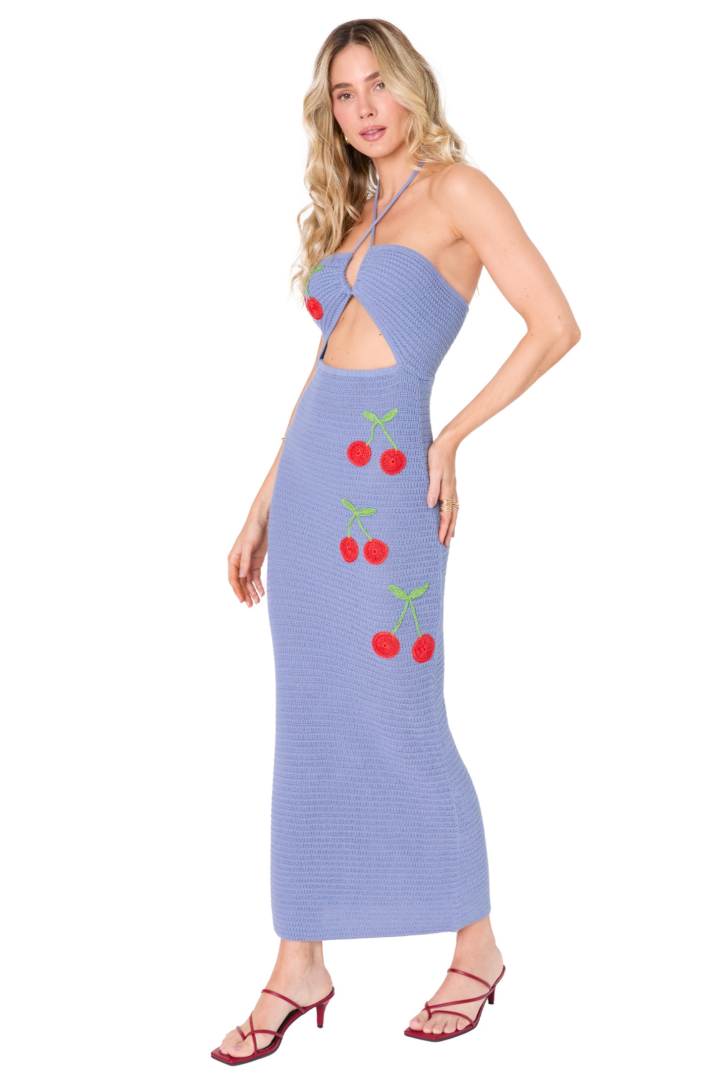 Vestido largo tejido en azul con detalles bordados de cerezas, que añade un toque divertido y colorido. Con abertura en el pecho y diseño ajustado, este vestido es ideal para la playa o la piscina. Hecho con prácticas sostenibles.