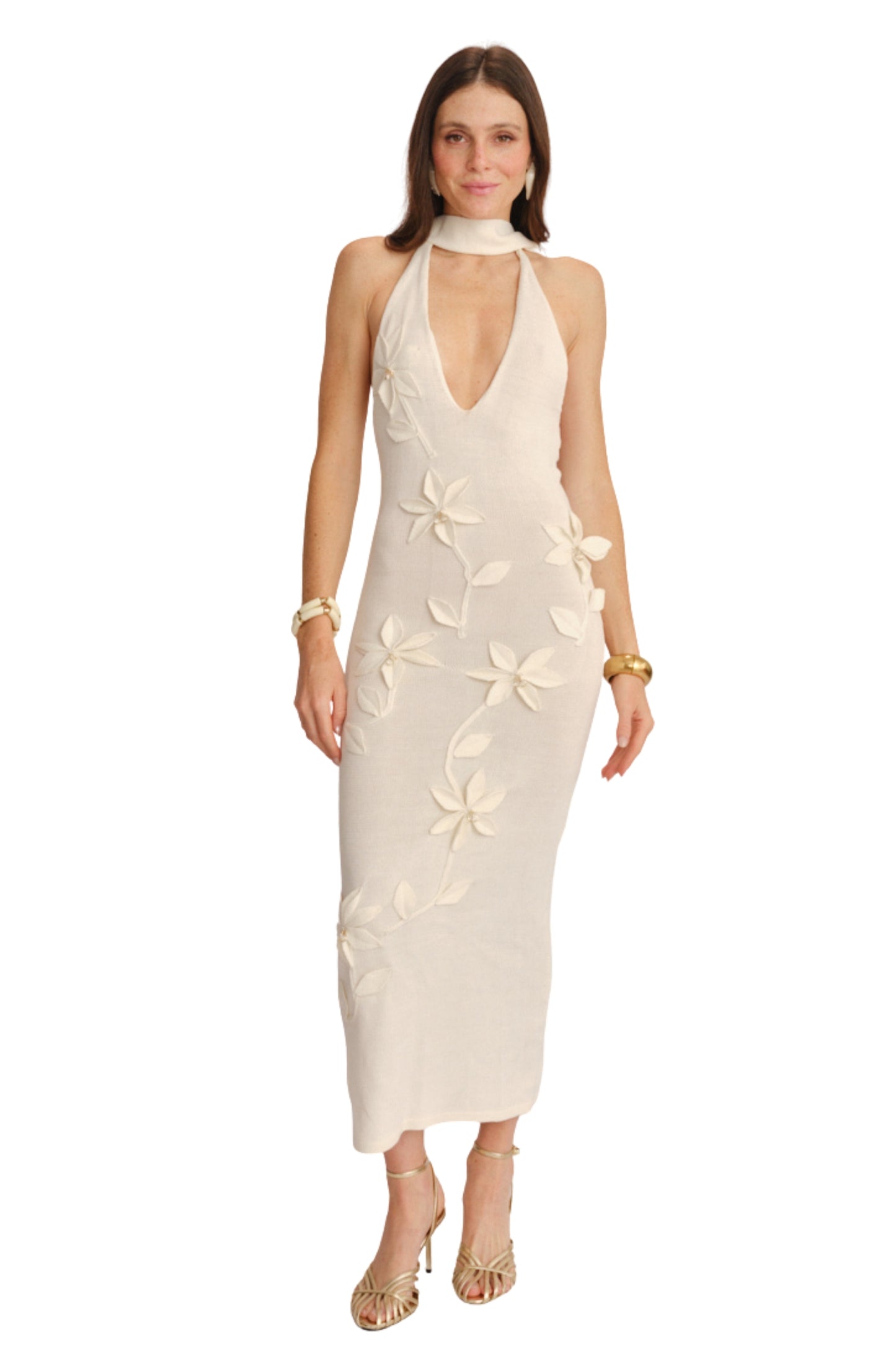 Eleva cualquier ocasión con este vestido largo en tono blanco, diseñado para destacar con elegancia y personalidad. Su silueta ajustada estiliza la figura y se complementa con un escote halter profundo que aporta un toque sofisticado y moderno. El detalle protagonista: flores 3D aplicadas a lo largo del frente, cada una con delicados centros tipo perla que añaden textura, movimiento y un acabado artesanal que lo hace único. El largo hasta los tobillos crea una caída fluida y femenina ideal para eventos de noche, cenas especiales o celebraciones.