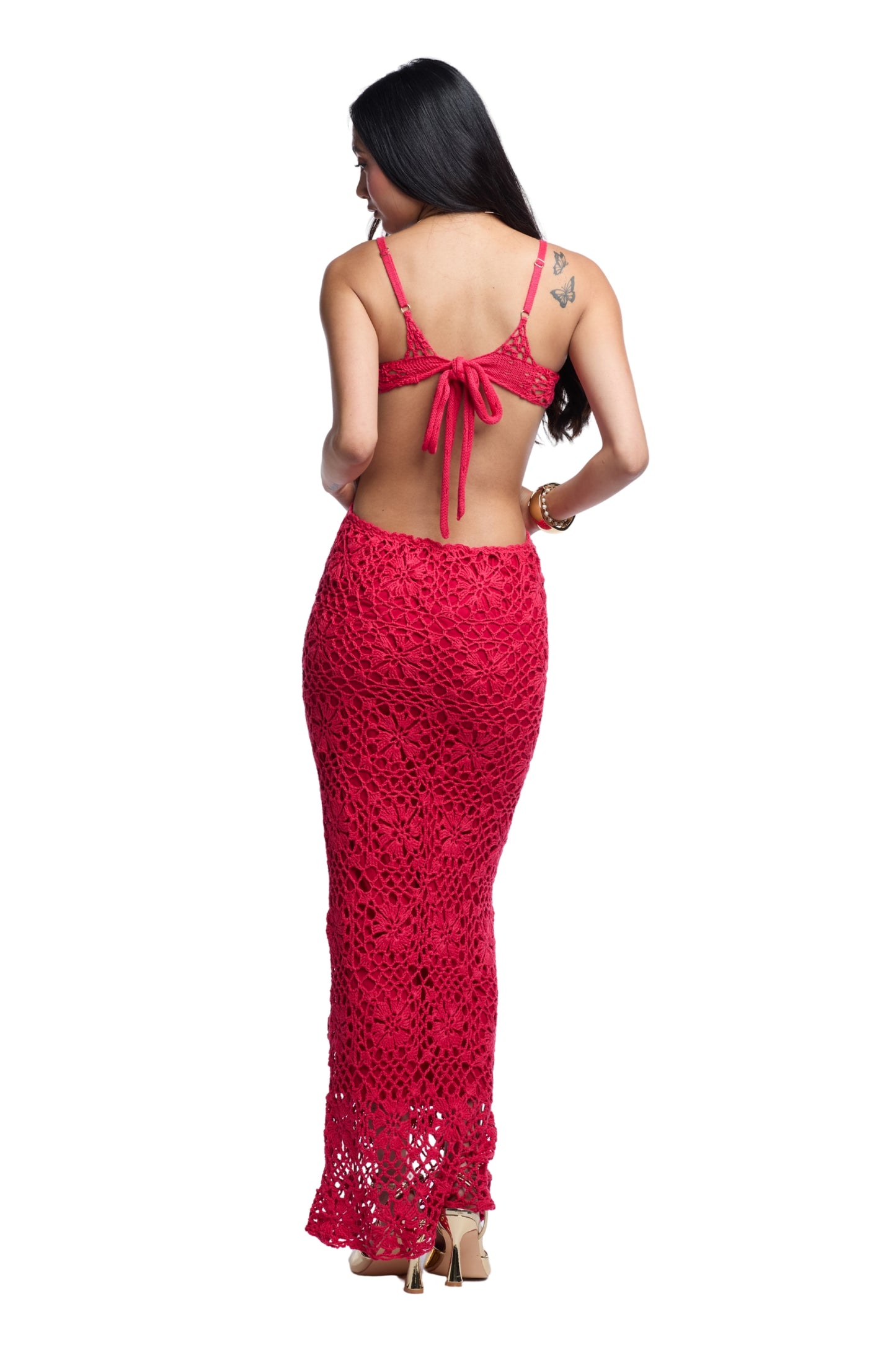 El Martina Red Roses es un maxi vestido rojo tejido a mano en crochet, con copas en rosas 3D y cortes laterales unidos por un aro forrado en hilo. Lleva forro chalis en la falda. Una pieza artesanal hecha en Perú.