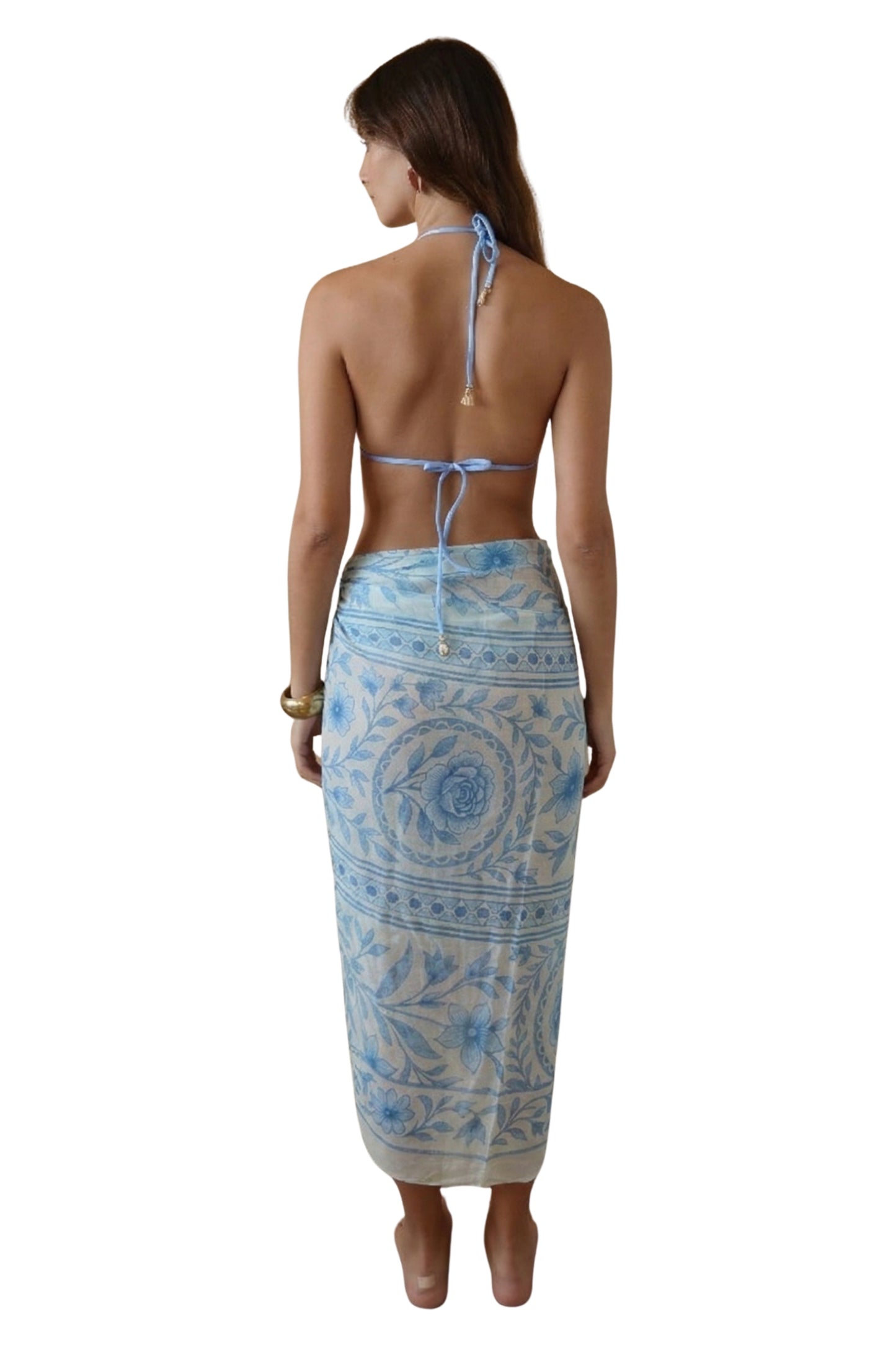 Pareo largo de tela ligera y fresca, con un delicado estampado floral en tonos azules que aporta un estilo elegante y veraniego. Su diseño versátil permite ajustarlo fácilmente a la cintura, creando una silueta cómoda y fluida.