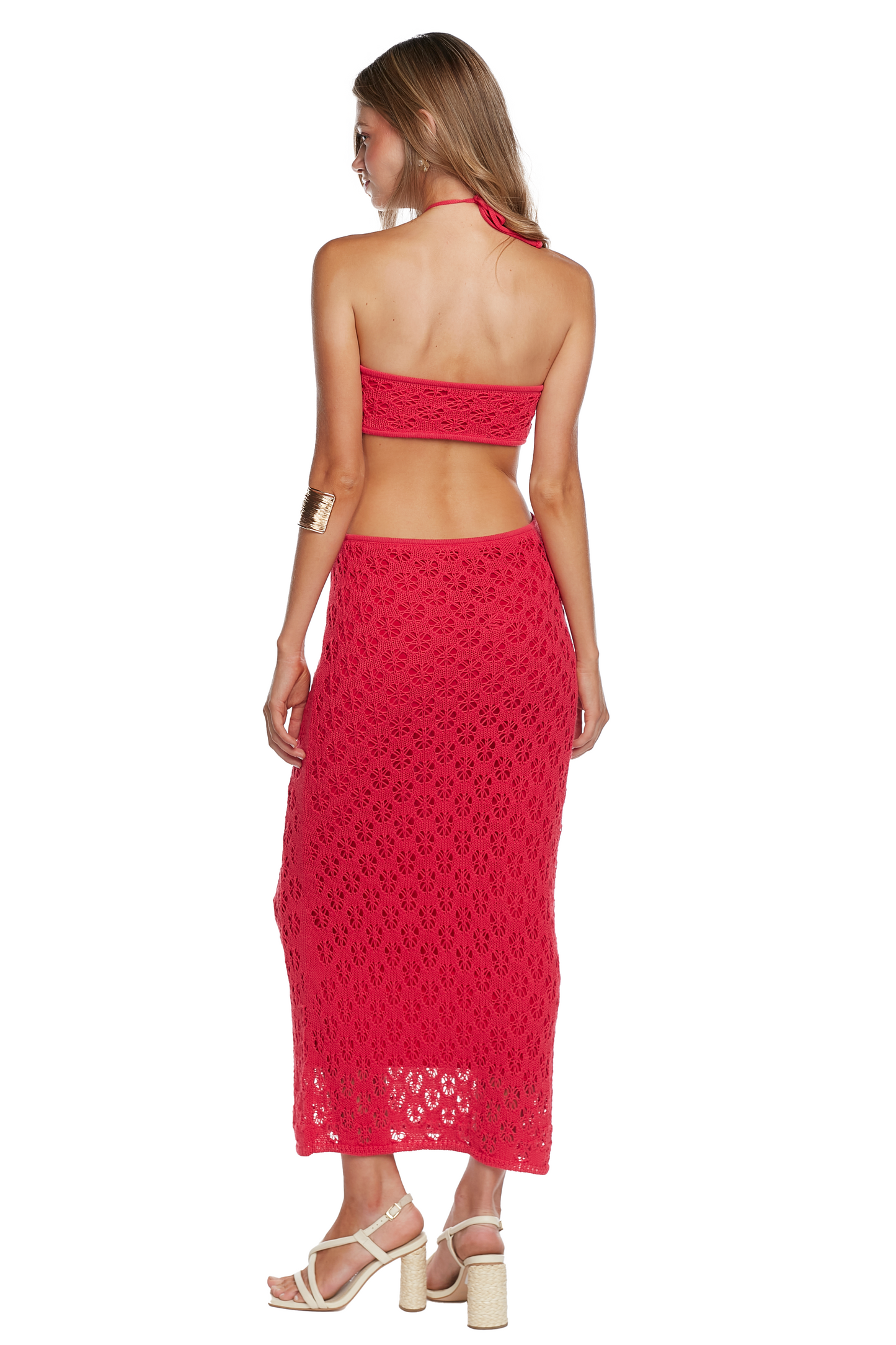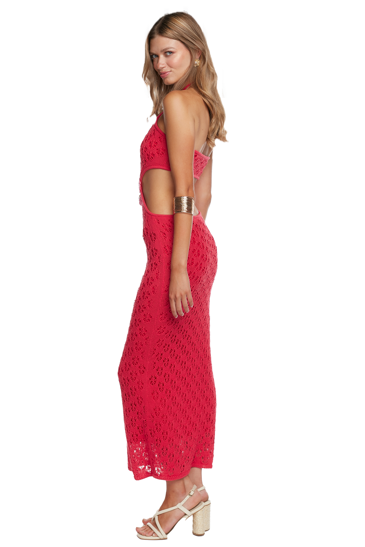 Este espectacular vestido largo combina un diseño artesanal con un toque sensual y moderno. Tejido con un delicado patrón calado, resalta la silueta con aberturas laterales estratégicamente ubicadas a la altura de la cadera. Su detalle central, una flor tejida a mano, añade un acento romántico y femenino. Perfecto para lucir elegante y sofisticada en cualquier ocasión especial.