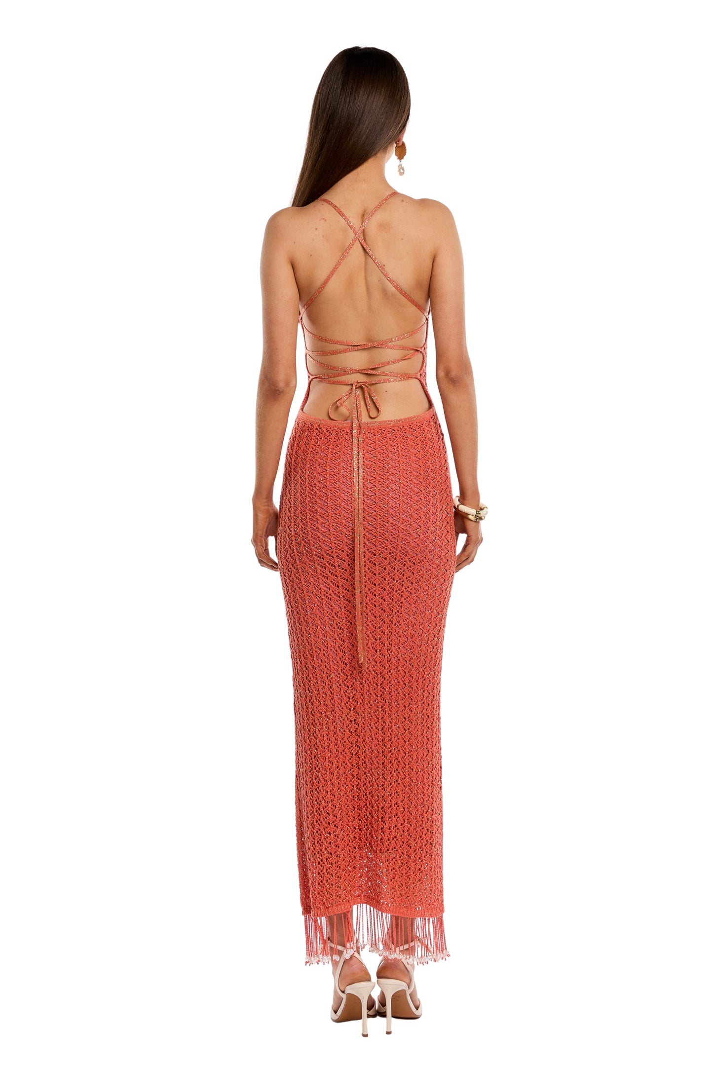 El Ali Peach Pearls es un maxi vestido ajustado con lúrex dorado, flecos y perlas cosidas a mano. Cada perla es colocada individualmente. Cuenta con tiras ajustables en la espalda. Una pieza artesanal hecha en Perú.