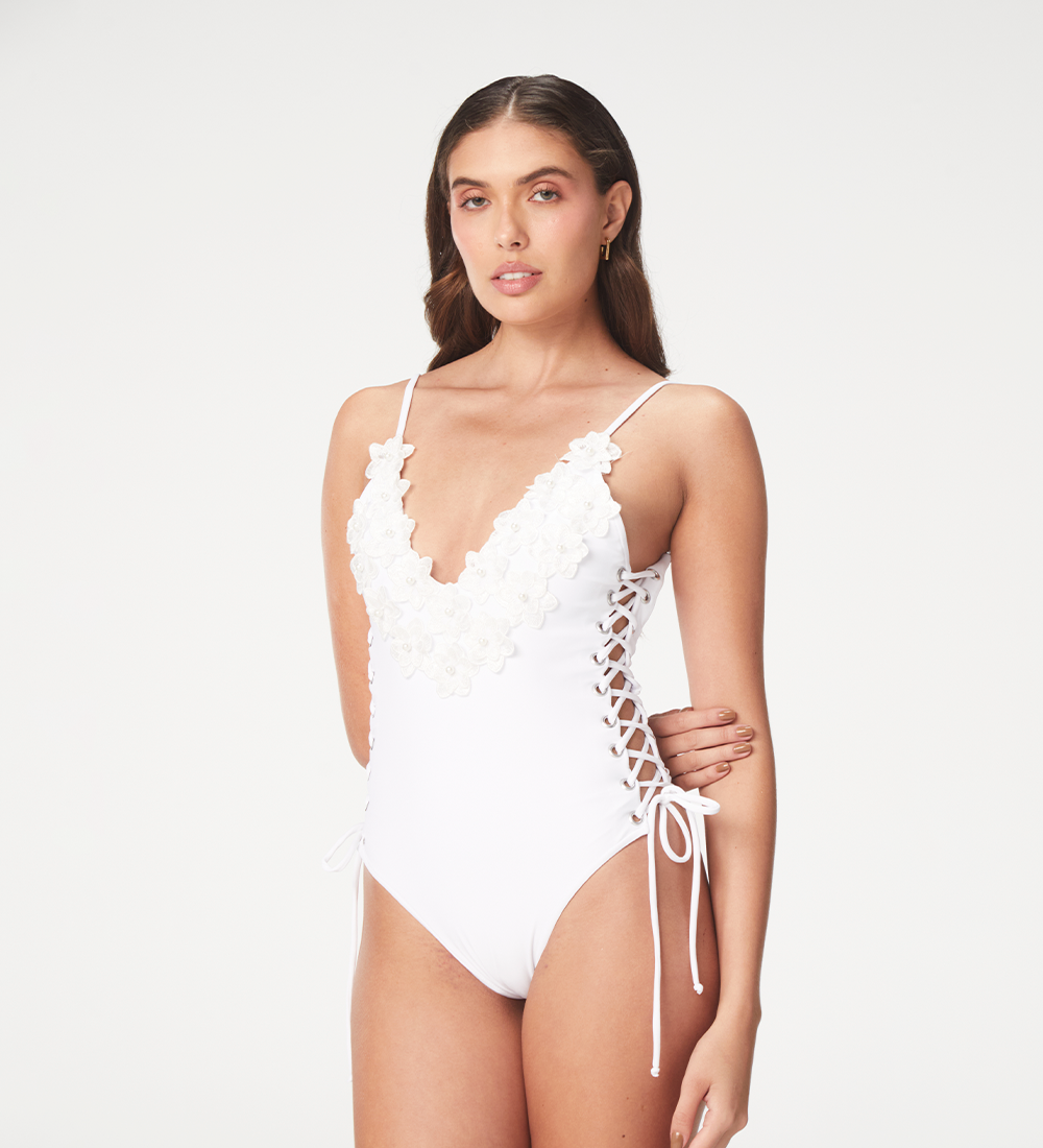 La ropa de baño soñada totalmente blanca! Diseñada con dos lados ajustables y con detalles de flores en el pecho. Esta entera es sencilla pero coqueta. Producido en una fábrica sustentable y hecho a mano por artesanos peruanos.