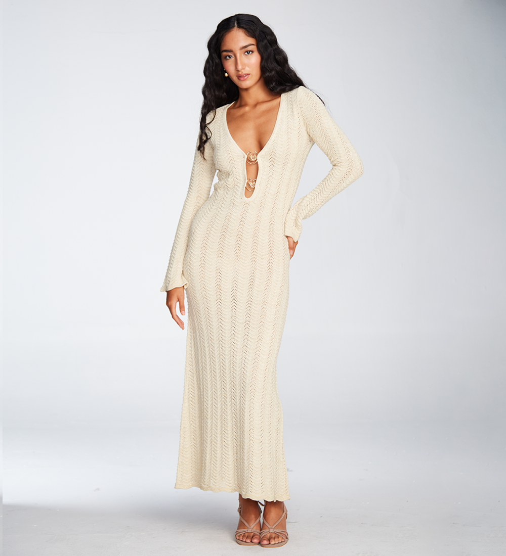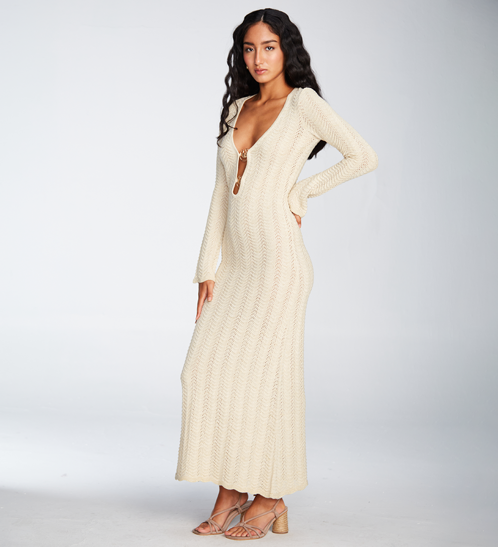 Shine everywhere con nuestro maxi vestido tejido ivory. Los detalles de Ella Gold dress en hilo dorado shiny y las seashells doradas en el escote crean un look elegante y soft, ideal para días relajados en la playa o eventos al aire libre. Producido en una fábrica sustentable y hecho a mano por artesanos peruanos.