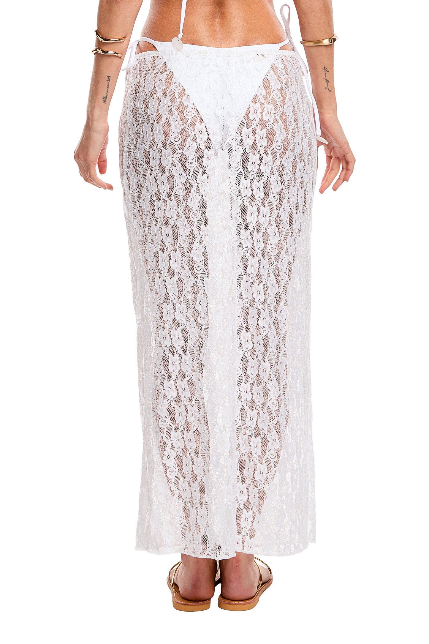 Falda blanca con diseño calado que deja entrever la piel, ideal para lucir sobre el bikini. De estilo bohemio y fresco, con textura ligera y caída suave, perfecta para la playa o la piscina.