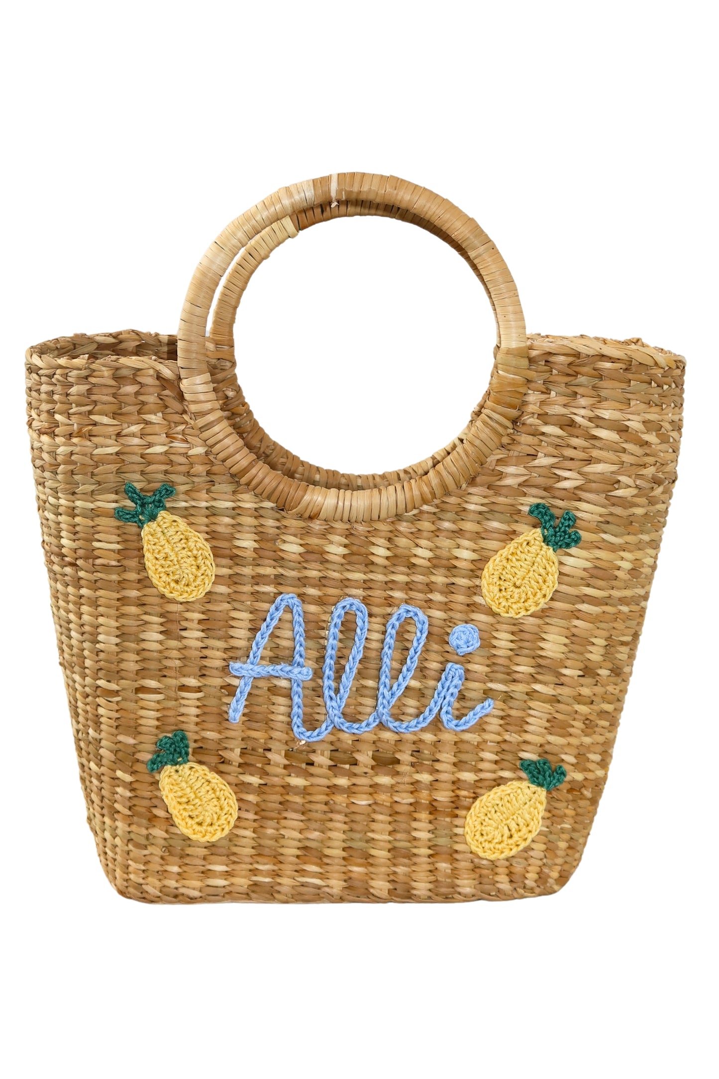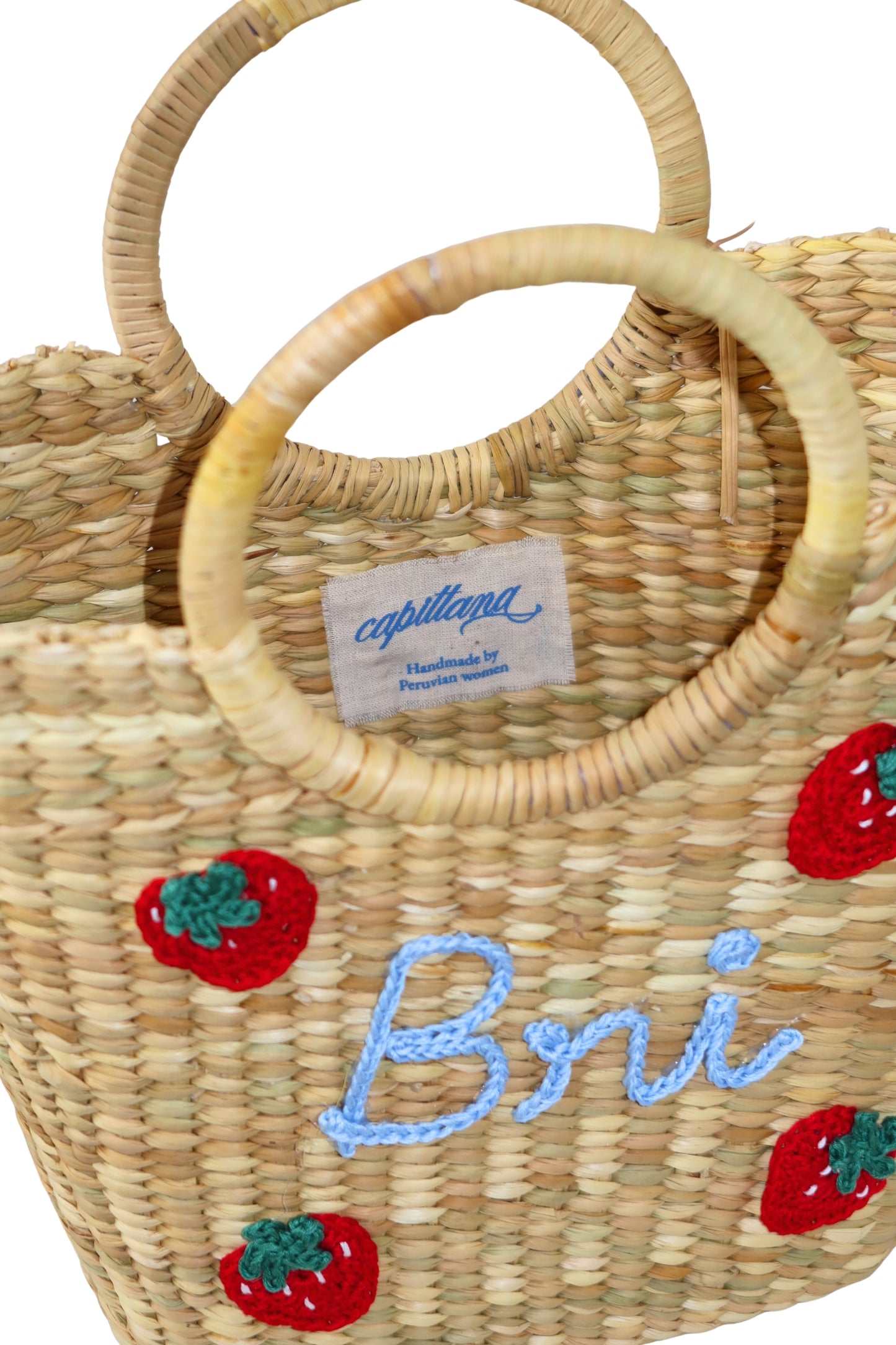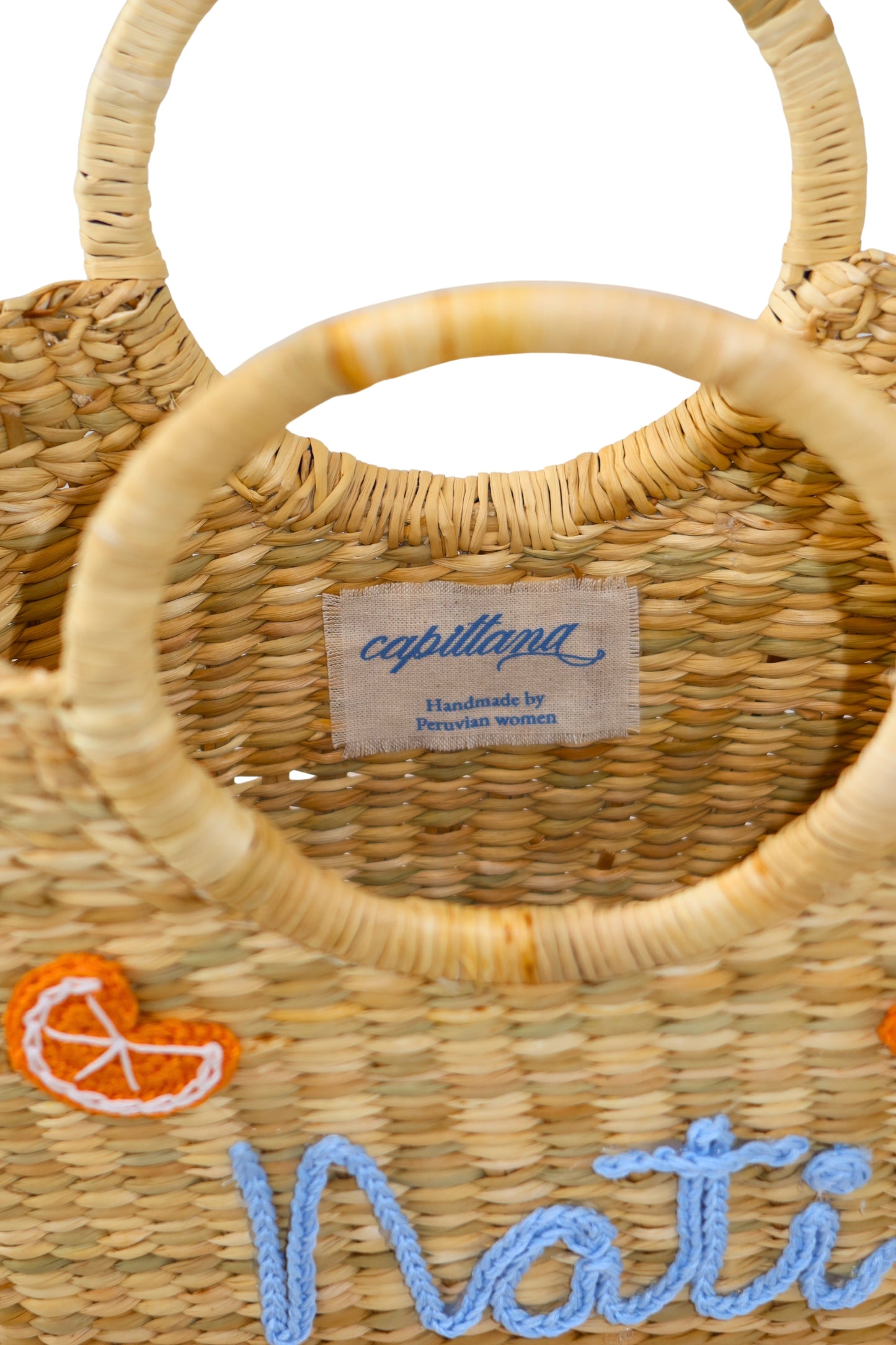 Mini tote de junco natural de la costa peruana, tejidas a mano por artesanas de Piura. Cada pieza presenta un armado impecable, detalles de frutas en crochet y nombre personalizado, creando un diseño exclusivo que eleva la artesanía tradicional a un lujo contemporáneo.
