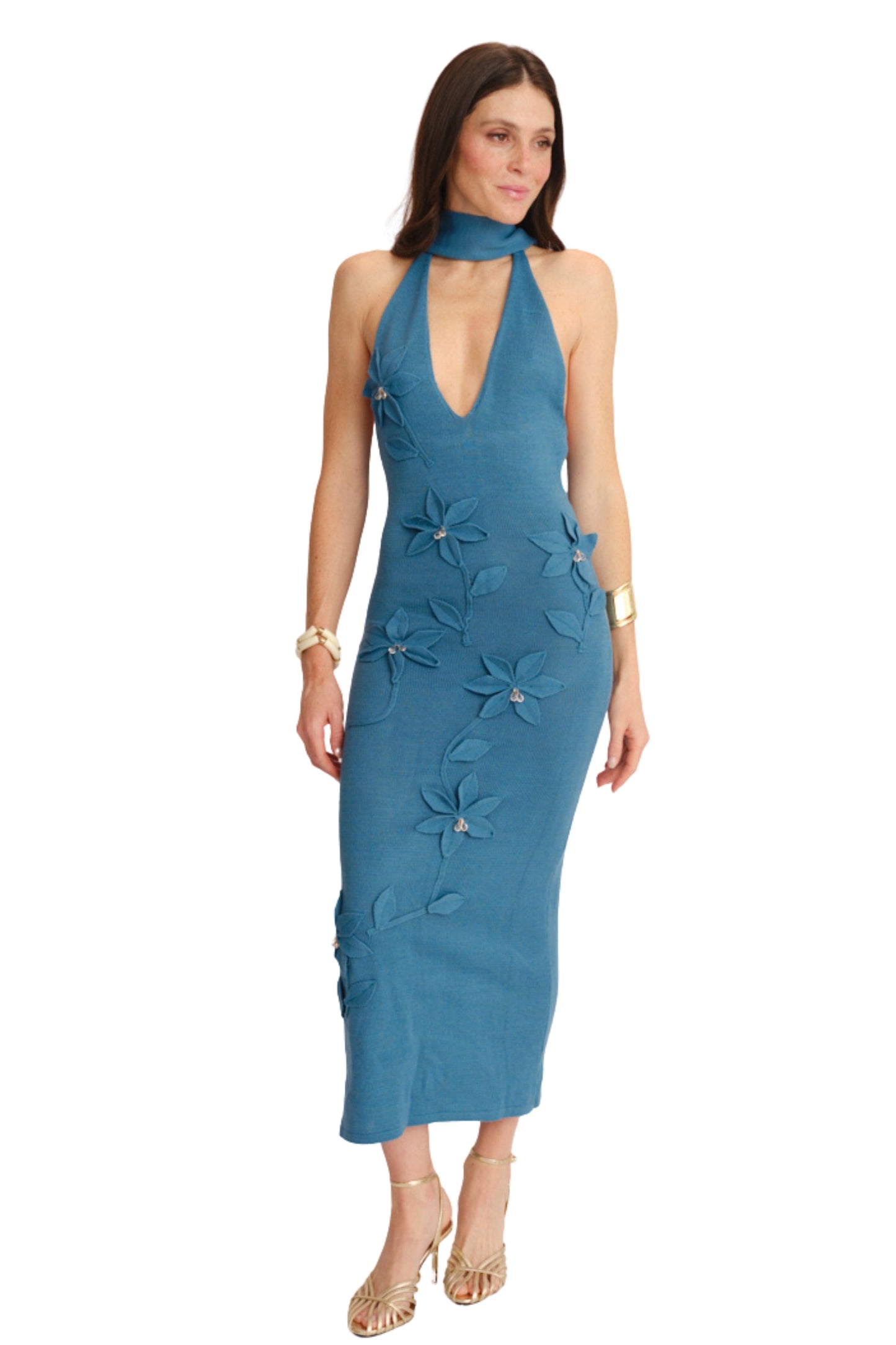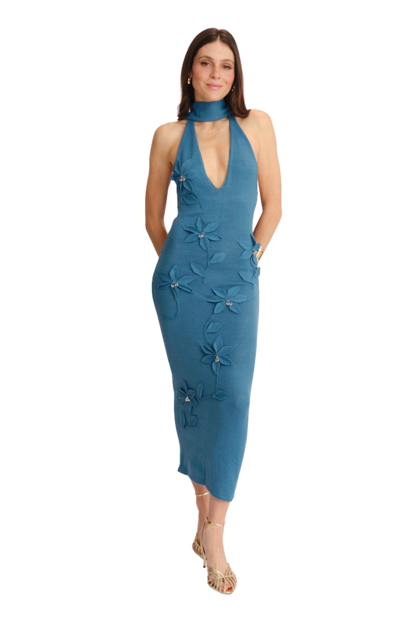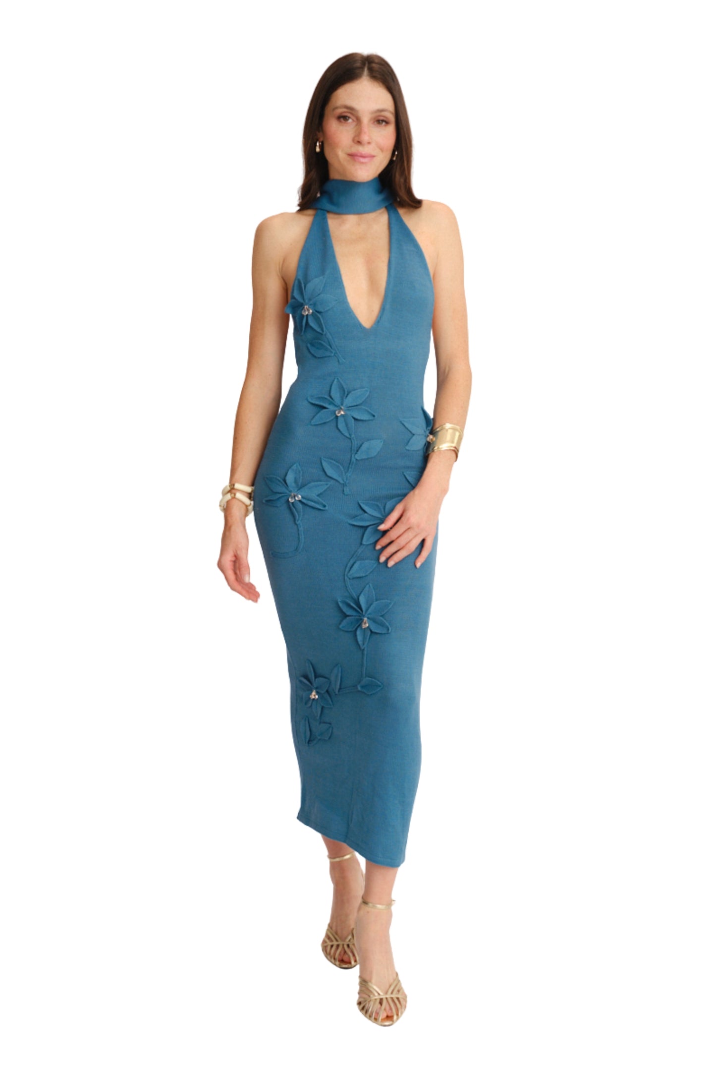 Eleva cualquier ocasión con este vestido largo en tono jade, diseñado para destacar con elegancia y personalidad. Su silueta ajustada estiliza la figura y se complementa con un escote halter profundo que aporta un toque sofisticado y moderno. El detalle protagonista: flores 3D aplicadas a lo largo del frente, cada una con delicados centros tipo perla que añaden textura, movimiento y un acabado artesanal que lo hace único. El largo hasta los tobillos crea una caída fluida y femenina ideal para eventos de noche, cenas especiales o celebraciones.
